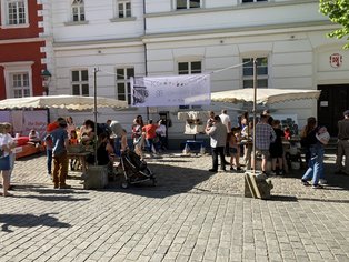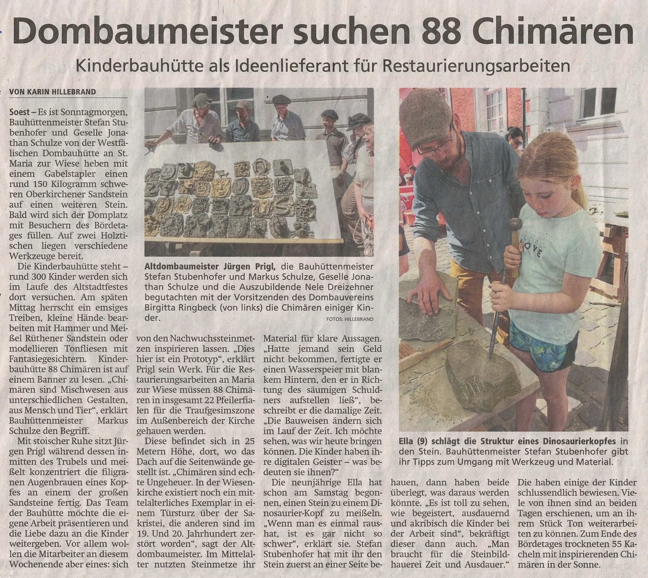 Auf dem Bördetag 2022 veranstalteten wir am 14. und 15. Mai mal wieder eine Kinderbauhütte. Hierfür wurde zwischen Patroklus-Dom und Rathaus unsere mobile, offene Werkstätte so errichtet, wie wir das seit Jahren sporadisch und rein freizeitlich machen. Als Thema wurde die "Chimären" angesprochen, als historisch immer wieder gestaltete Fabelwesen, die auch an den Fialen der Traufengalerie der Wiesenkirche im Zuge der Instandsetzung und Sanierung wieder geschaffen werden müssen. Der inhaltlich sehr gute Presseartikel gibt aufschlussreich weitere Informationen.