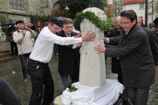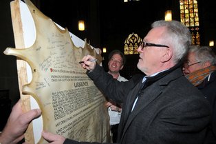 | Erste Beurkundungen mit kurzen Grüßen durch: | Kinder der Gemeinde, sowie nachfolgende Ehrengäste: KR TR Franz Bamberger, Ehrenpräsident der EACD/Soester Runde Dombaumeister Dr. Michael Hauck M.A., Köln Werkmeister Marcial Lopez, Basel Dr. Wolfgang Platter, Direktor Nationalpark Stilfser Joch, Beirat EACD Regierungspräsident Dr. Gerd Bollermann |