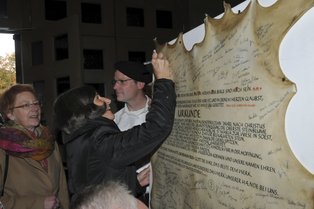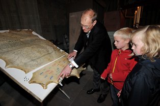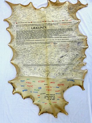 Auf die Soaster Kuhhaut können alle Namen signiert werden; das Pergament wird im Helmgiebel des Turms eingebaut