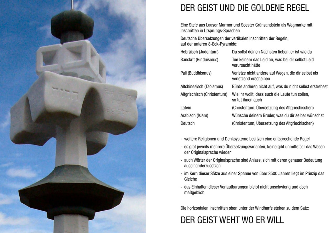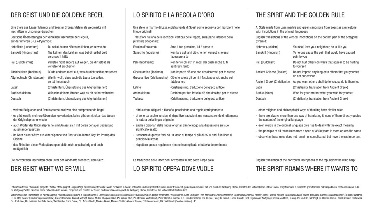 Die Versionen der Goldenen Regel sind in den Ursprungssprachen der Weltreligionen in Stein gemeißelt. Das Einholen der Originaltexte und die abschließende Nennung aller Mitwirkenden, die für dieses Objekt sämtlich unentgeltlich tätig waren, ist auf einer Tafel in Deutsch, Italienisch und Englisch aufgeführt. Die Vorlagen für die Steininschriften entstanden quasi global, aufgrund der Fehlermöglichkeiten jedoch nicht mittels im Internet dargestelltem Wissen, sondern im Letzten durch kompetente Persönlichkeiten, wie z.B: Landesrabbiner em. Dr. h. c. Henry G. Brandt, Saraswati Albano-Müller (Enkelin Mahatma Gandhis), Prof. Mahendra Shakya (Master of Buddhism Sumangai Kloster), Anita Chitrakar, Karl-Friedrich Bartlewski, Dr. Hassan Daoud, ...