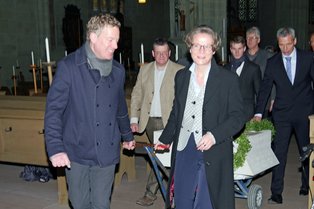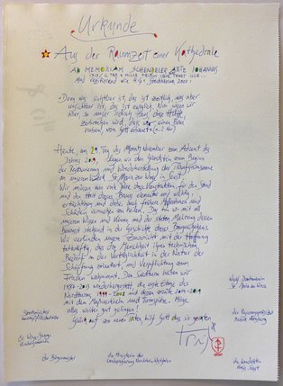 Vor diesem Hintergrund war unverzügliches Handeln notwendig, betonte Dombaumeister Jürgen Prigl, der die Grundsteinlegung als „historischen, vielleicht sogar wichtigsten Schritt für das gesamte Bauwerk“ bezeichnete. Bevor der 350 Kg schwere Grundstein an seinen Bestimmungsort über dem Südchor verbracht wurde, erhielt er in der Wiesenkirche in einer schlichten Zeremonie seine „Inneren Werte“, die Urkunde sowie zahlreiche kleine Papierstücke, auf denen Menschen ihre Gedanken notiert und so dem Bauwerk anheim gegeben hatten.