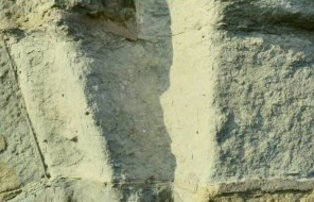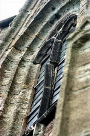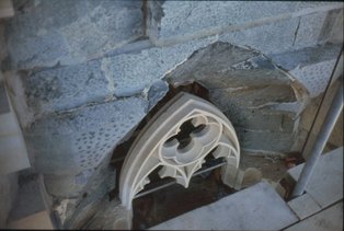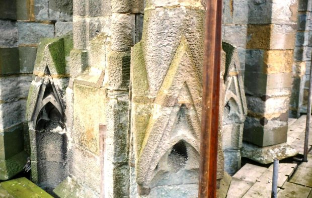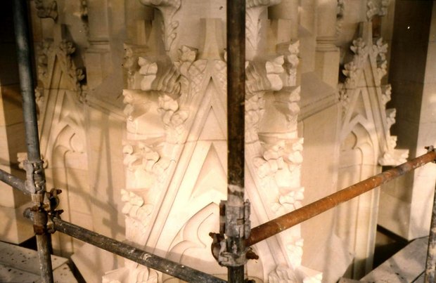 Blick auf eine Wimpergecke der 1. Zone, welche die Ausbildung der ca. 18 m hohen und über 70 t schweren, frei stehenden Riesenfialen aus der Turmecke markiert. Der originale grüne Stein ist zerstört und die wertvolle gotische Zier ist abhanden gekommen. Das geschah einerseits durch den sogenannten Zahn der Zeit, also durch Verwitterungen, aber ebenso durch Verlust wichtiger Festigkeitseigenschaften im Steinmaterial. Andererseits wurde der Verlust wertvollster Substanz im Laufe der Geschichte einmal auch von Menschenhand herbeigeführt.