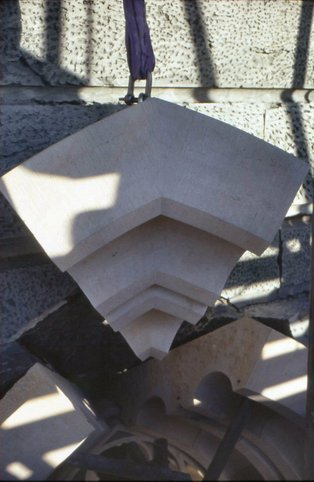 Eine besondere Schwierigkeit an den Türmen stellte der Steinabbau dar. Hierfür wurde ab 1993 eine neue Verfahrenstechnik entwickelt, bis hin zum Einsatz von Diamantseilsägen. Theoretische Grundlage dafür ist das exakte Einmessen von Richtungen anhand der Turmgeometrie. Die Art der Anfertigung von Werksteinen geschieht in einer Mischung von industrieller Technik und von handwerklicher Technik, bzw. Technologie, jeweils auch in reiner Form. In der Bauhütte selbst werden neben der aufwändigen manuellen Anfertigung von Laubwerkarbeiten (Krabben, Kreuzblumen etc.) auch kompliziertere Profilarbeiten durchgeführt. Nachfolgend vier Abbildungen vom Versetzen eines in Obernkirchener Sandstein wiederhergestellten Maßwerkes und seiner gebogenen Laibung bis zum eingepassten Schluss-Stein, in Verzahnung Schicht um Schicht mit der verbliebenen Originalsubstanz aus Grünsandstein: