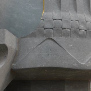 Aus dem kreisrunden Stamm erwächst im vertikalen Zug ein Zehneck: Gott erteilt seine Gebote, zehn an der Zahl, so viele wie der Mensch Finger hat, so viele Mondmonate wie vergehen von der Zeugung bis zur Geburt. Das Zehneck weitet sich in die Horizontale und bildet aus dem Stamm die Basis der Krone. Mit erneuter Umlenkung in den Ecken entstehen und teilen sich Linien, werden mehr und laufen wechselnd wellenförmig. Das will markieren: Gott entfaltet im eingeborenen Sohn Mensch werdend eine Dreieinigkeit. Ein Band wächst als dreizonige Gliederkette heraus und umfasst das Oberteil wie einen Kelch, der sich hier nun öffnet. Auf dem Grund der inneren Öffnung des massiven Steinblocks steht der Prediger. Grundelement der Glieder des Bandes ist das Quadrat, als Symbol für menschliches Leben auf der Erde: vier Himmelsrichtungen, Tages-, Jahreszeiten, Lebensphasen etc. Durch die zweifache Ausformung der Quadrate erscheinen die Kreuzungspunkte dieses Bandes je nach Standpunkt und Lichtstellung verbindend und/oder scheidend.