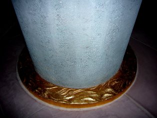 Durch die parallelen Stege transportieren goldene Feuerzungen das Licht aus dem Stein in den Kelchrand der Krone. Dort wölbt sich die Materie aus, Wind weht durch Windungen. Außen und innen geraten in Bewegung. Der Geist weht, wo er will. Nicht Vakuum, Luftströme sind Träger von Laut und Klang. Phänomene der Globalisierung wie Informationsexplosion, Vereinzelung, Massenidentität oder Sprachvermischung sind assoziiert. Der Kranz gleicht einem Windspiel, das sich multiplizierende Kommunikationsformen impliziert.