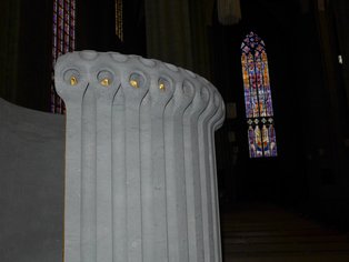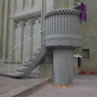 Die Steinkanzel steht wie ein vormaliges Sperrholzprovisorium an der Grenze der Kirchenhalle vor dem südlichen Chorpfeiler. Sie ist gegliedert in einen unteren Bereich, den Stamm, und einen oberen, die Krone genannt, in welche man aus dem Hauptchor über das siebenstufige Treppenelement hinein gelangt. Der Stamm entsteht aus der Form eines Kreises. Das geometrische Grundgebilde ist ein Ursymbol: Es hat weder Anfang noch Ende; es ist vollkommen. Der Mittelpunkt des Ausgangskreises gründet unter der Bodenoberfläche und ist Beginn eines lotrechten Fahrstrahls als Stammachse der Kanzel. Die Stelle, an welcher der Stamm in die sichtbare Welt tritt, umfasst ein Feuerring, gegossen aus Eisen und vergoldet in der Farbe Gottes. Dies suggeriert: „Sei vorsichtig und behutsam, es ist ein besonderer Ort.“ Nicht sichtbar also im Ursprung und im Geist ausgehend von „Im Anfang war das Wort …“ zeigt die Kanzel im Verlauf Mitteilungen Gottes hin zu „… und das Wort ist und wirkt“.